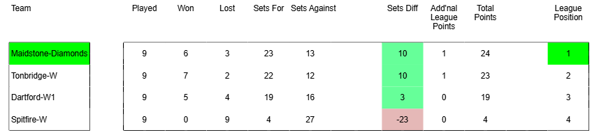 Diamonds performed the best, earning a place in the SEVA tournament via winning the KVCA Women’s Premier Division! This was an exceptional achievement by Coach Frank and the players. It often required players to play out of position. They won the league by a single set point. It was a narrow victory over a very competitive Tonbridge team, who also joined the SEVA tournament.